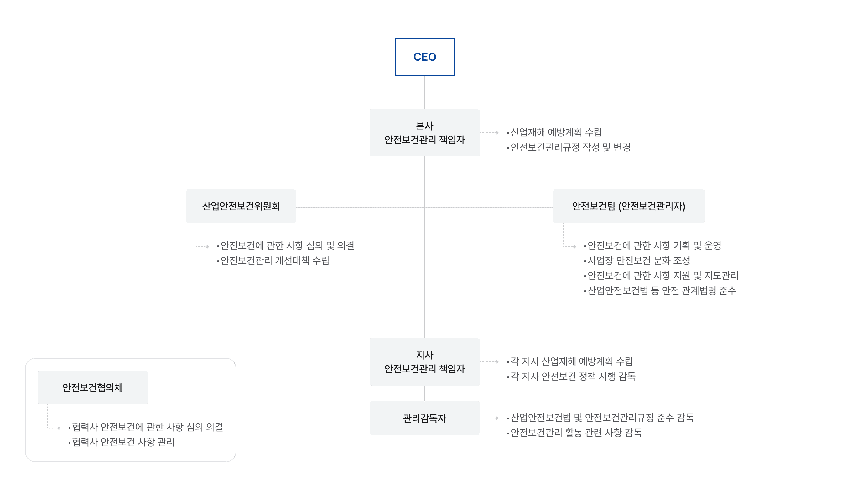 구성원과 협력사가 참여하여 안전 보건에 관한 사항을 심의 및 의결, 안전보건관리 사항에 대한 개선대책을 수립하는 ‘산업안전보건위원회’, ‘안전보건협의체‘를 운영하고,