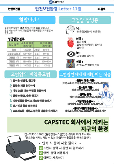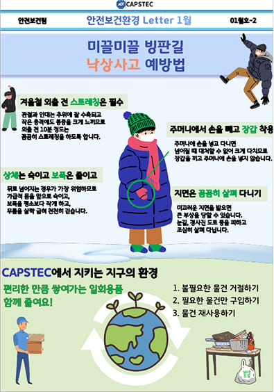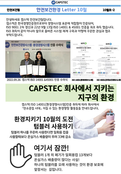 캡스텍 안전보건팀에서는 비즈니스 추진 과정에서 발생할 수 있는 환경영향과 산업재해 발생을 최소화하기 위해 구성원 및 협력사를 대상으로 안전보건환경 레터를 발행하고 있습니다.